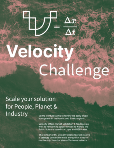 Velocity is particularly aimed at startup teams with university or research lab backgrounds working on innovations that accelerate global green transformation, cutting-edge life science and health technologies, or groundbreaking new technologies that are changing entire industries. You don’t have to have a perfect pitch deck or paying customers, but we want to see more than an idea on a napkin. We are looking for the best ideas with great potential and an impact on people, the planet, or the industry.